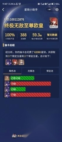 3、实时数据统计:实时统计玩家的抽卡情况,帮助玩家了解抽卡概率。