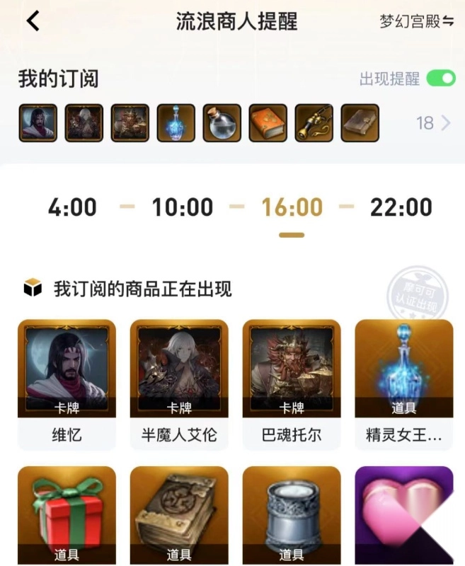 流浪商人入口:App首页的五连推广位。功能:可以查看游戏内流浪商人的位置,还能设置提醒,订阅具体商品的推送,防止错过传说卡牌和稀有道具。