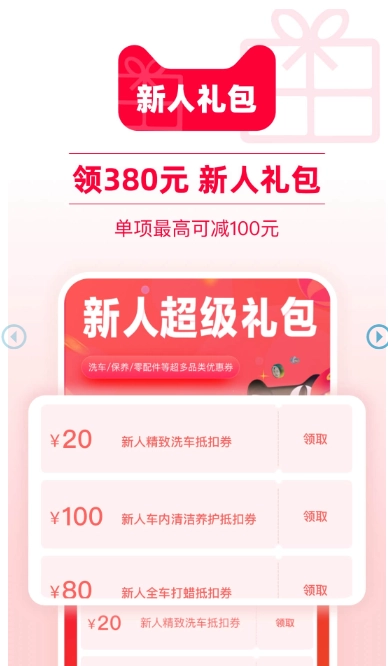 天猫养车推出了新人注册福利活动,用户只需登录平台,就能领取一份价值380元的超值礼包,该礼包可用于汽车养护相关服务。