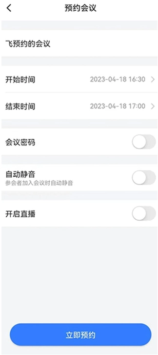 2、设置好会议的开始和结束时间,点击立即预约。