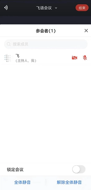 3、现在就创建成了一次会议,到时间时就可以开始开会了,这里可以看到参会者,可全体静音。