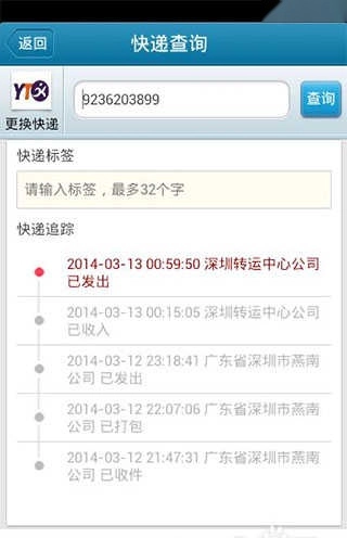 5、快递查询:可在查询页面输入快递单号,也能直接扫描快递单上的条形码;扫描完成后会跳转至快递公司选择界面,选定快递单对应的快递公司,即可直接进入物流详情页面。