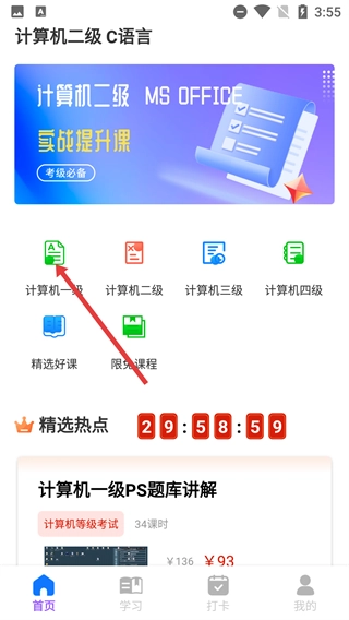 进入应用后,点击【计算机一级】入口,即可进入相应等级的学习模块,还能查看【精选课程】等学习资源。