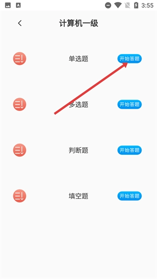 2、在题型选择页面,找到【单选题】右侧的【开始答题】按钮,点击即可进入该题型的作答环节。