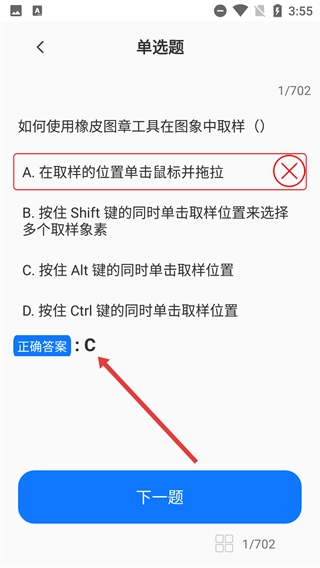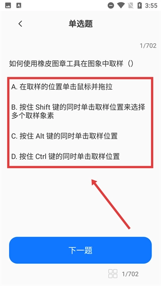 3、进行单选题作答时,先阅读题目(例如【如何使用橡皮图章工具在图象中取样】)以及各个选项,选定对应的答案后,点击【下一题】即可进入下一道题目。