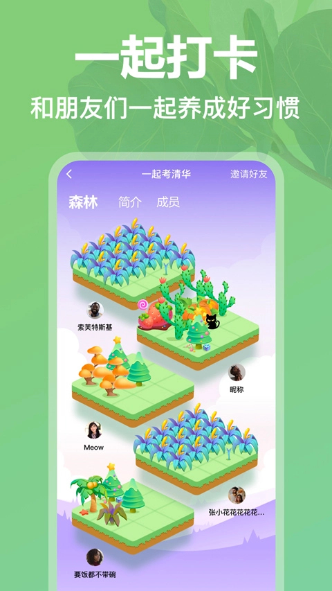 2、社交互动功能:打卡森林设有好友邀请及互动机制,用户能够查看好友设定的目标和当前进度,彼此间相互鼓励、监督,携手实现共同成长。