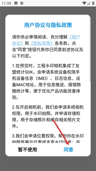 1、仔细阅读【用户协议】与【隐私政策】中的各项条款,在充分了解权限申请的相关说明后,点击弹窗里的【同意】按钮。