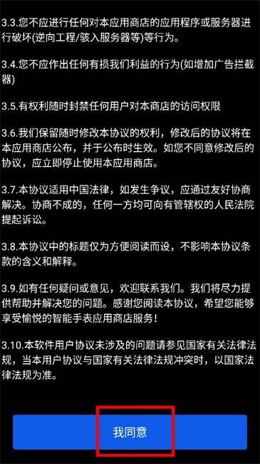 打开软件后,请仔细阅读并同意相关协议,这样才能继续使用本应用商店。