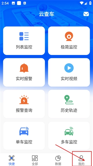 1、进入【云查车】后,能使用【列表监控】-【极简监控】-【实时报警】等功能,通过底部切换到【我的】进入个人中心。