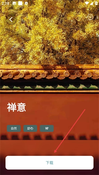 3、在【禅意】详情页,点击对应按钮即可保存该主题内容,此外页面还标注有“自然-舒心-禅”的标签属性。