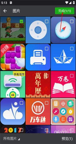 2、进入图片选择界面,浏览呈现的各类图片,勾选想要裁剪的图片,点击完成按钮确定选择并跳转。