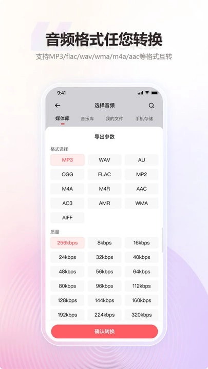 【格式转换】可实现多种音频格式的转换操作,涵盖mp3、aac、m4a、wma、wav、flac等格式。