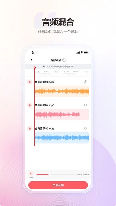 【音频混合】把多个音频文件合并成一个,可灵活调整背景音乐与主旋律的音量大小,轻松完成专业级的音频混合剪辑工作。