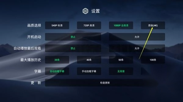 2、设置中选择画质,最高4K原画。还能设置开即自启动、自动播放最后观看、自动字幕等功能。