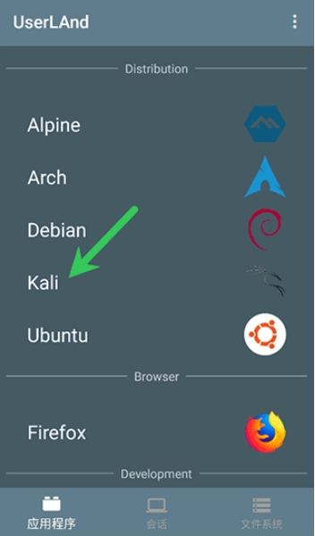 1、当 UserLAnd 首次启动时,它会显示常见发行版和 Linux 应用程序的列表,例如用户想要通过它来安装Kali