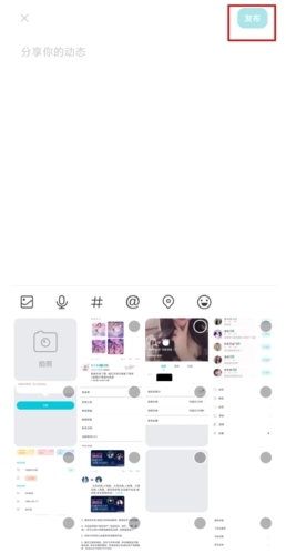 2、输入拟发布的动态内容,还能插入图片、话题链接等素材,之后点击右上角的发布按钮即可完成操作。