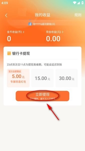 第二个“提现0.3元至支付宝”,点击其后的“立即提现”按钮,系统会随机发放现金奖励。