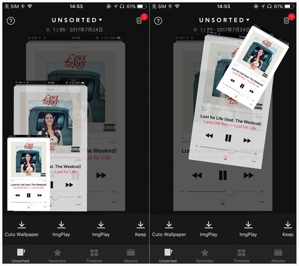 3、完成初始设置后,就可以着手整理相册了。整理相册的操作方式很简单,主要有这几种:向上滑动可删除图片,点击下方的相册能把当前图片归类到对应的相册里,左上角的按钮则用于撤销操作(iOS端额外有收藏和长按分享的功能,不过我用Slidebox只是为了整理图片,这些功能对我来说用不上,有需要的用户可以自行使用)。之后,通过简单的滑动和点按操作,就能把所有图片分类好。分类完成后打开系统相册,会发现所有图片都已经按照你的分类完成了归类。