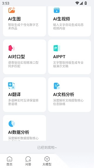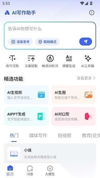 1、打开应用首页可见功能分区,包含核心写作模块和快捷入口