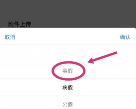 第5步,我们要挑选请假的类型,比如事假、病假或者公假。选好之后点击确认按钮就可以了。
