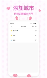 3、点击进入城市管理页面后,能够查看已添加的城市天气信息,像厦门、北京、海南等城市都包含在内,该页面还支持城市的添加与管理操作。