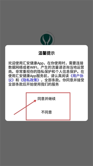 1、打开【汇安健康App】后,阅读【用户协议】-【隐私政策】,点击【同意并继续】按钮,即可进入App主界面。