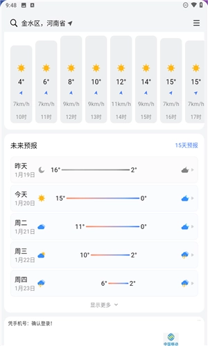 5、向上滑动页面,就能查看今日不同时段的天气温度变化;此外,未来15天的天气预报也能在这里一目了然。