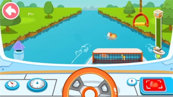不妨再去河道清洁体验区瞧瞧!那里的水面上漂浮着香蕉皮、纸团、汽水瓶之类的各种垃圾,要怎么给河流来一场“大扫除”呢?操控清洁船就能解决——先启动船只,把方向盘向左转动,让网兜凑近漂来的垃圾,把它从水里捞出来;瞧,右边又漂来碎瓦片了,赶紧把方向盘往右转,把这块垃圾也捞进网兜里吧。