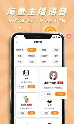 1、智能配音:输入文字秒变语音,上百种音色可供选择,支持音量、语调、语速调节