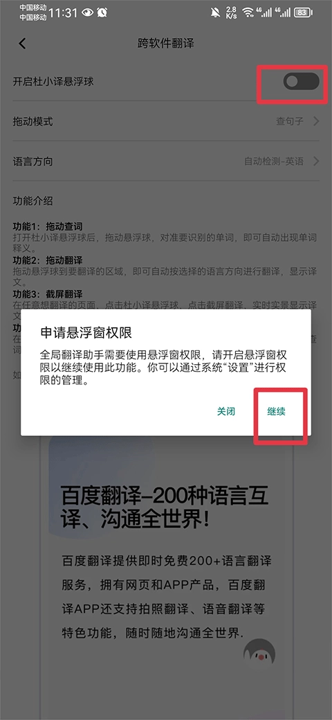 3、进入后点击开启杜小译悬浮球,此时会弹出悬浮窗权限申请,点击继续即可