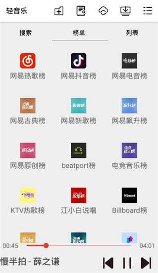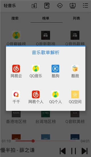 榜单:可以登录个人账号获取个人歌单,可以查看网易、酷狗、Q音、酷我、虾米等多个平台的榜单,发现更多好听歌曲