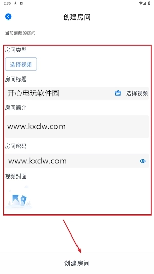 “选择视频”就是选择要一起看的动漫,房间简介和密码随意设置,点击“创建房间”;