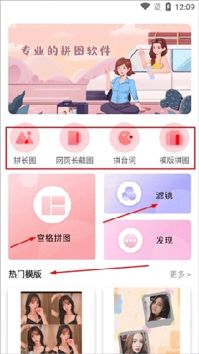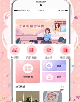 1、启动MIX拼图应用,在主页上能看到拼长图、网页截图、拼台词等功能选项,同时也有热门模板可供挑选,选择任意一种拼图模式即可开启拼图操作。