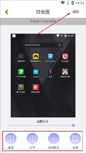 3、下面可以选择拼图的模式(垂直、水平、边框等),点击右上角保存。