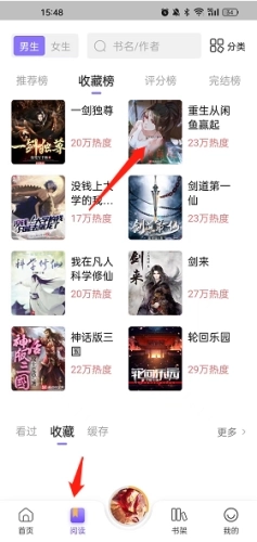 1、打开软件,点击底端的“阅读”选项,然后选择自己喜欢的小说。