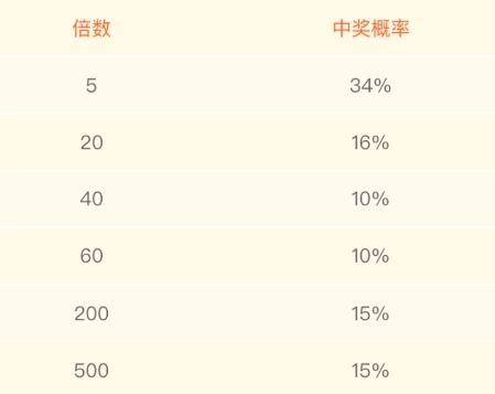 每个幸运礼物获得中奖资格的概率是4.5%,在获得中奖资格之后,会再随机确定拟中奖倍数,其概率情况如下: