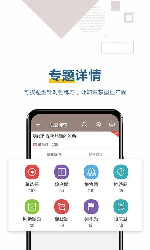 2、这款软件收录了丰富的历史题目,且依据知识点做了分类整理,用户能够结合自身需求开展针对性的练习。