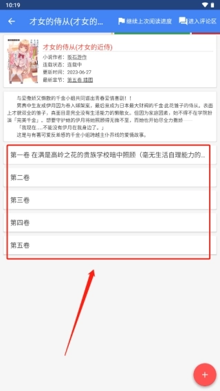 2、进入小说简介界面,选择右下角红色【+号】图标;