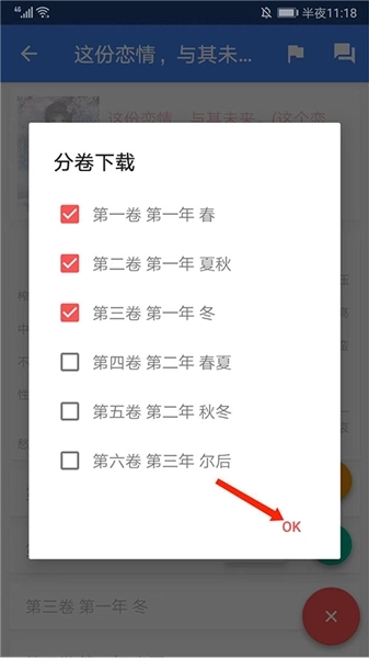5、进入分卷界面,勾选需要的内容后,选择右下角【OK】选项就可以小说了。