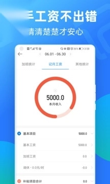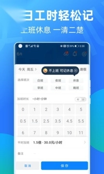 3、记加班功能可同时满足记加班、记工时、算工资、记考勤的需求,既是便捷的工资计算器,也是您的记加班管家与备忘录。
