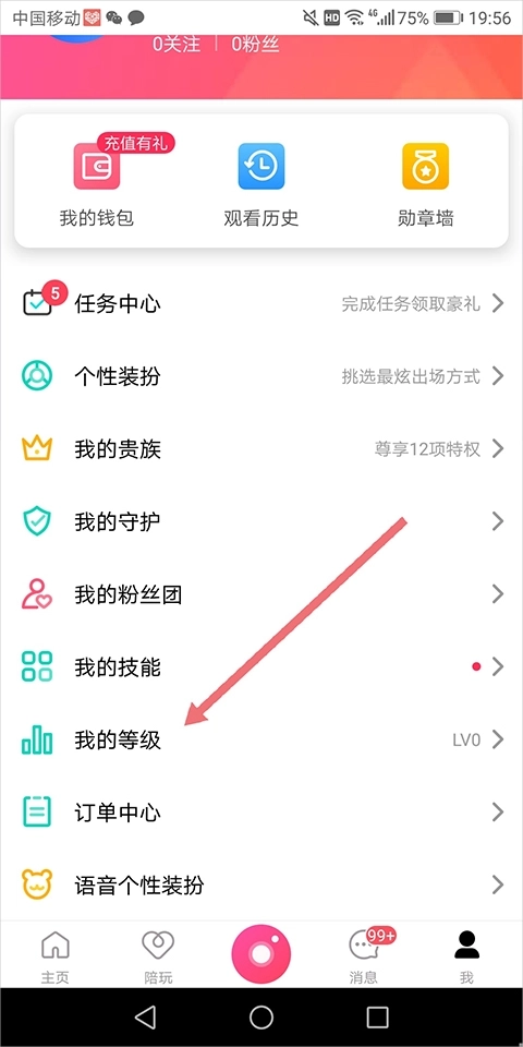玩家若想了解详细内容,可打开并登录迅雷直播手机版,点击底部的【我】,进入新页面后,找到并点击【我的等级】(即下图中红色箭头所指的区域)。