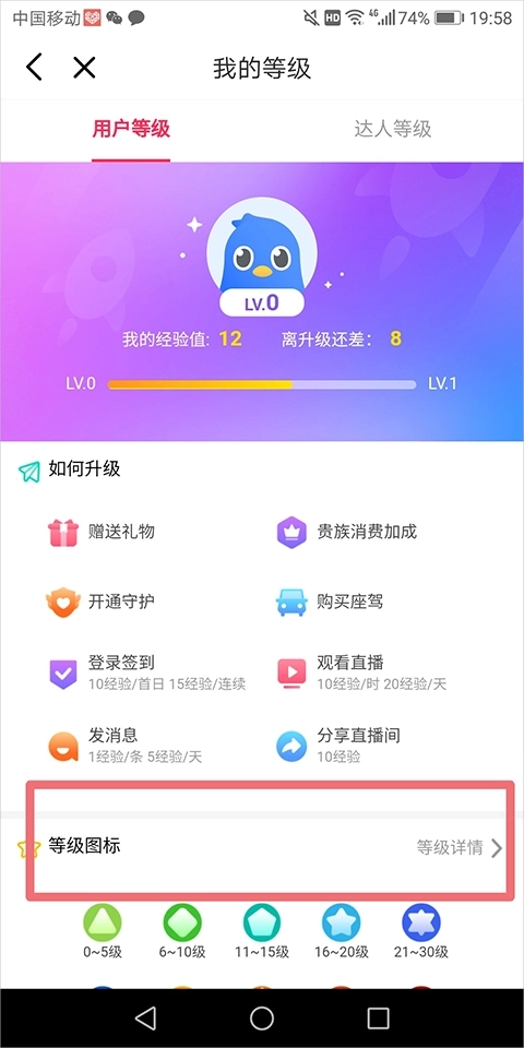 然后点击【等级图标】右侧的【等级详情】(下图红色方框处)