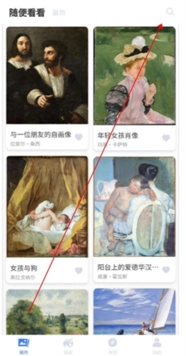 1、在软件的首页中能够查看到优质的绘画,之后点击右上角搜索框。