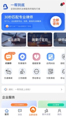 一帮到底法律服务平台打破传统法律服务格局,凭借高效智能的服务模式,精准对接用户的法律需求。平台携手资深调解团队,助力纠纷快速化解,同时有效控制成本。提供文书代写、案件委托等全方位专项法律服务,为用户匹配最适配、最专业的解决方案。此外,平台整合全国法律资源,覆盖企业法务、个人咨询、知识产权等多元领域,专业律师线上线下全天候响应,为用户提供细致的法律指导,让法律问题不再成为生活的困扰。