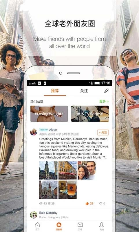2、进入【教师动态】的【朋友圈】页面,查看Ms-Flor等老师发布的动态内容,可进行关注等互动操作。