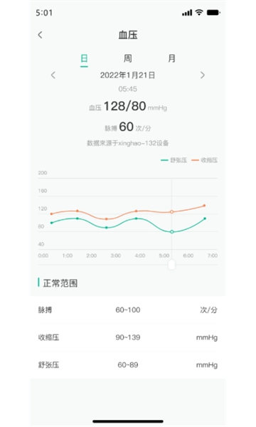 将血压的波动情况以图表形式呈现给用户参考,分别展示收缩压、脉搏、舒张压三种指标,且图表下方配有参考范围,方便用户自行查看身体的实时状况。
