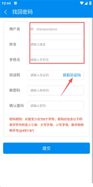 2、在找回密码页面填写用户名、姓名、手机号后,点击获取验证码按钮获取验证信息。
