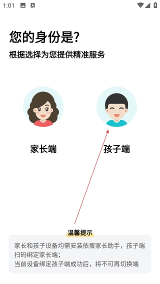 1、进入身份选择页,点击【孩子端】选定使用身份。