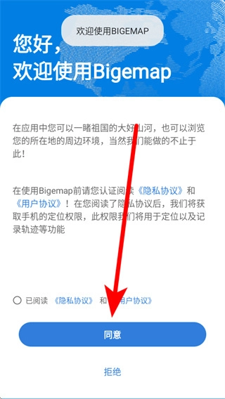 1、打开BIGEMAP,在欢迎页面勾选协议选项,点击同意,进入主界面。