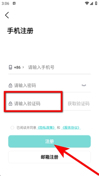 3、在手机注册页面,输入手机号和密码,点击获取验证码。